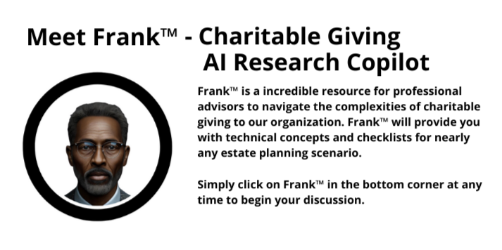 Frank™ for Advisors is an innovative generative AI tool designed to assist estate attorneys and other advisors with questions about complex planned giving and estate planning concepts.